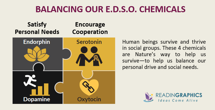 The 4 chemicals are Nature’s way to help us survive, by balancing our personal drive and social needs. In our full book summary, you can get more details about each of the E.D.S.O chemicals and their effects, as well as that of the stress-related hormone Cortisol.