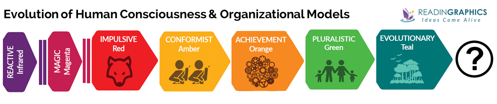 Indeed, human history has shown that as we evolved, we’ve changed the way we organize ourselves and collaborate with one another. At each point of our evolution, our organizational models (e.g. societies, economies, power structures) reflect our consciousness and psychological development (e.g. our needs, values, self-identity, cognitive/moral/spiritual development).