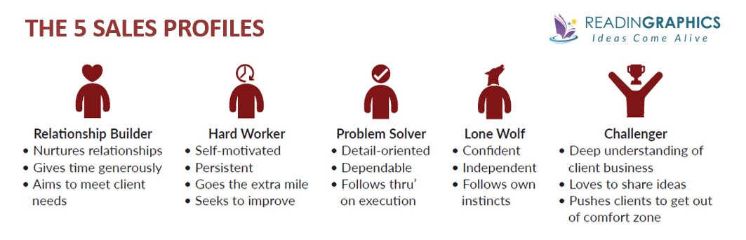 - Every sales person falls into 1 of 5 distinct sales profiles: the Relationship Builder, the Hard Worker, the Problem Solver, the Lone Wolf or the Challenger.