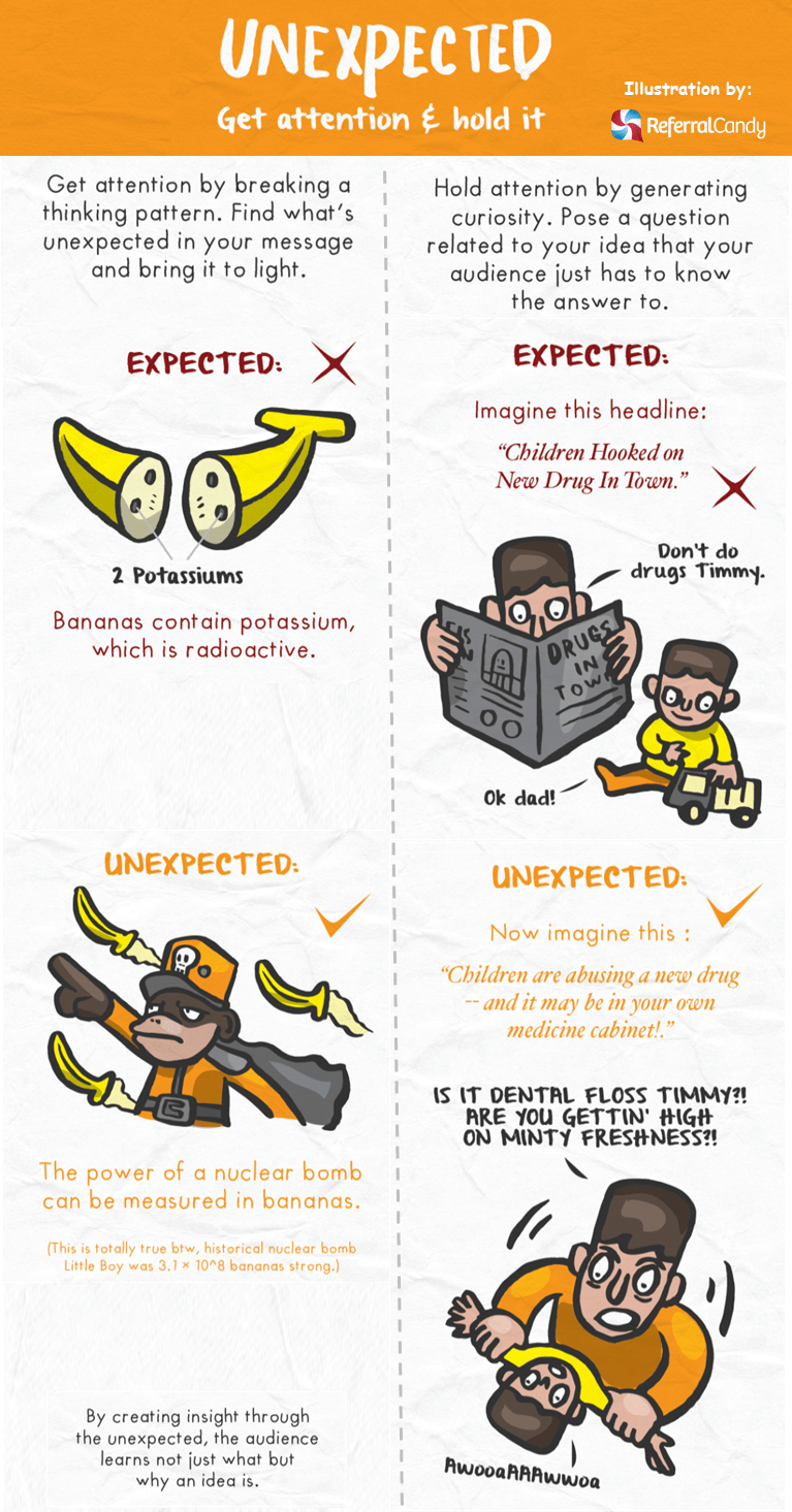To recap, here are the 6 key ingredients to make any message “stick” in your mind (read the details in our book summary).