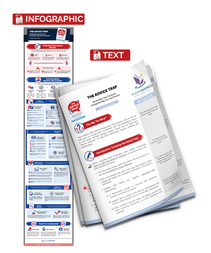 Most leaders offer well-meaning advice and answers, only to end up with wrong fixes, feeling overwhelmed, over-reliant teams and rigid organizations. In this book, Michael Stanier shares how to tame your “Advice Monster” to lead more effectively, improve thinking and relationships.